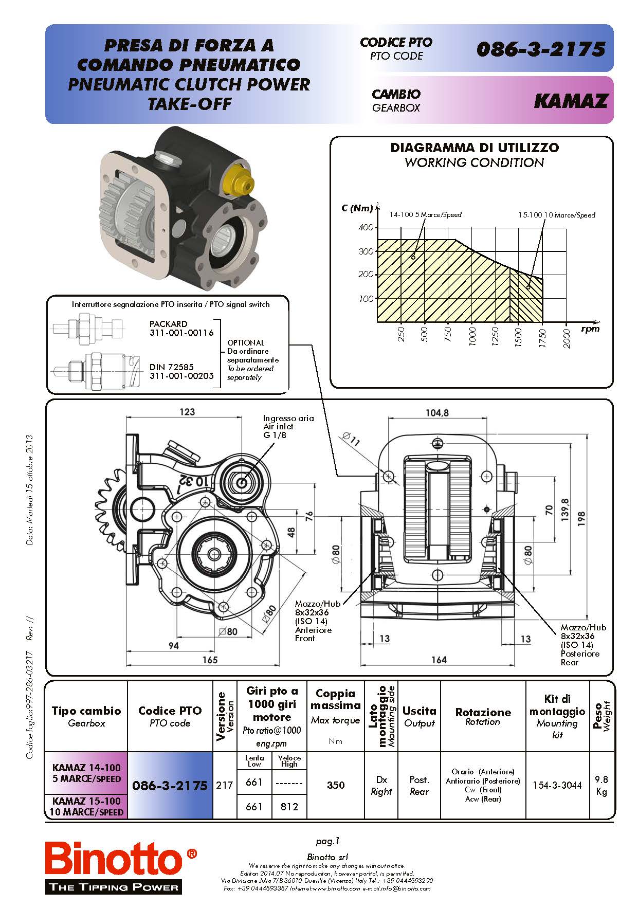 | Коробка отбора мощности 086-005-00175 ISO | Binotto | Коробка отбора мощности КАМАЗ Артикул: 08600500175 Крутящий момент максимальный (Nm): 220 Частота вращения КОМ при 1000 об/мин двигателя: 862 Вращение насоса: левое Выход: назад-стандарт ISO Управление: Пневматическое Масса (кг): 12 |